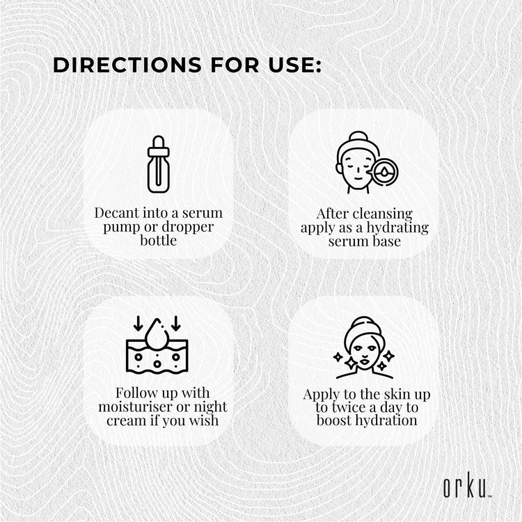 Directions For Use: Decant into a serum pump or dropper bottle and use after cleansing as a hydrating serum base. You can then follow up with moisturiser or night cream if you wish.