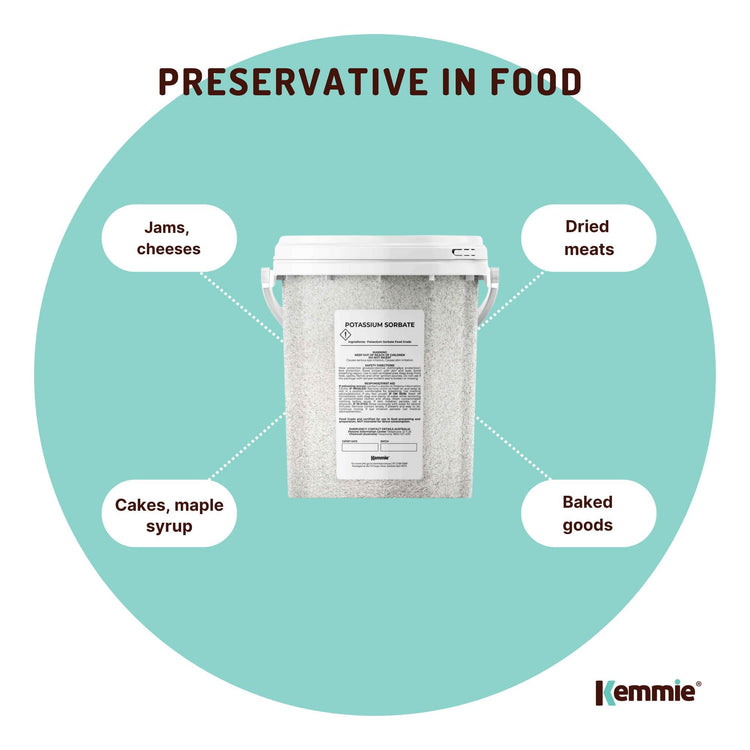 • Preservative in food (E202) - jams, cheeses, dried meats, cakes, maple syrup, baked goods