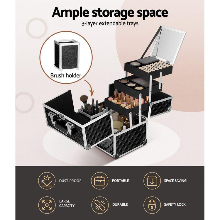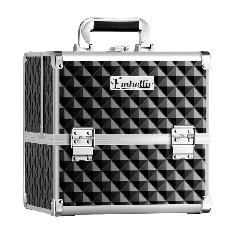 A professional makeup artist should have all the right tools at hand. What better way to keep your makeup organised than our stunning, stylish Embellir Beauty Case. Big enough for all your makeup and beauty products, but lightweight enough to make travelling a breeze, it's no longer a hassle take your beauty regime on the road. Three delicate trays fold out to hold all your supplies and includes a fold out mirror for quick fixes. The case is made of tough aluminium with an ABS plastic exterior for hardiness and durability. The inside is coated in black velvet for a luxurious look and feel, and to protect your products. The convenient carry handle, lightweight construction and lockable design make it perfectly portable. Whether you're a professional makeup artist or just a hobbyist, the Embellir Beauty Case is perfect for you!