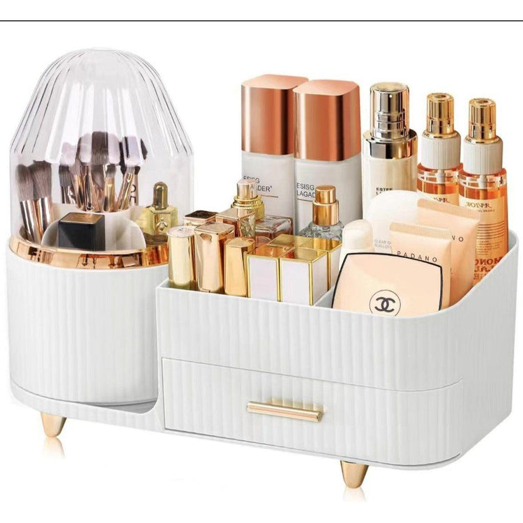 White Rotating Makeup Organizer Box - Multi-Compartment Cosmetic Storage with Dustproof Cover