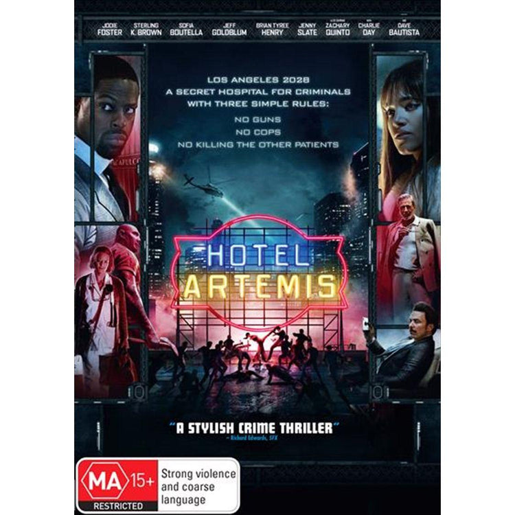 Set in riot-torn, near-future Los Angeles, HOTEL ARTEMIS is an original, high-octane action-thriller starring Jodie Foster as The Nurse, who runs a secret, members-only hospital for criminals. Jodie Foster is joined by an all-star cast that includes Sterling K. Brown, Sofia Boutella, Jeff Goldblum, Brian Tyree Henry, Jenny Slate, Zachary Quinto, Charlie Day, and Dave Bautista.