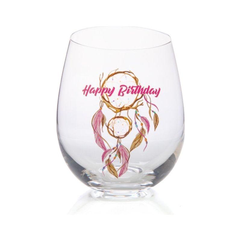 Hand-blown stemless wine glass featuring a whimsical dreamcatcher