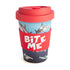 Matching red anti-spill lid and protective silicone band with 'Bite Me' quote