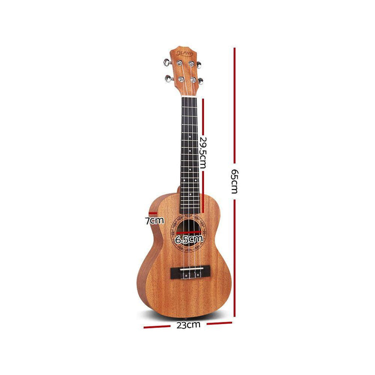 Alpha 26" tenor ukulele is easy to learn and play. And sounds great too. Our Alpha Ukulele promises to deliver hours of resounding fun as you sing and play your favourite tunes with wild abandon. Crafted from rich tone woods for a matt natural finish, our Ukulele features meticulous craftsmanship and quality components that others place a premium on. Such as the Mahogany top, back and sides, contoured back, rosewood fretboard, bone nut and saddle, premium nylon strings, decorative soundhole rosette and pre-installed strap pins on both ends of the body. Also included is a bonus carry bag to bring your music where it matters most. Among friends and an appreciative audience. So quit procrastinating and start your musical journey with the mesmerising sounds of the Alpha Ukulele. Get yours today.