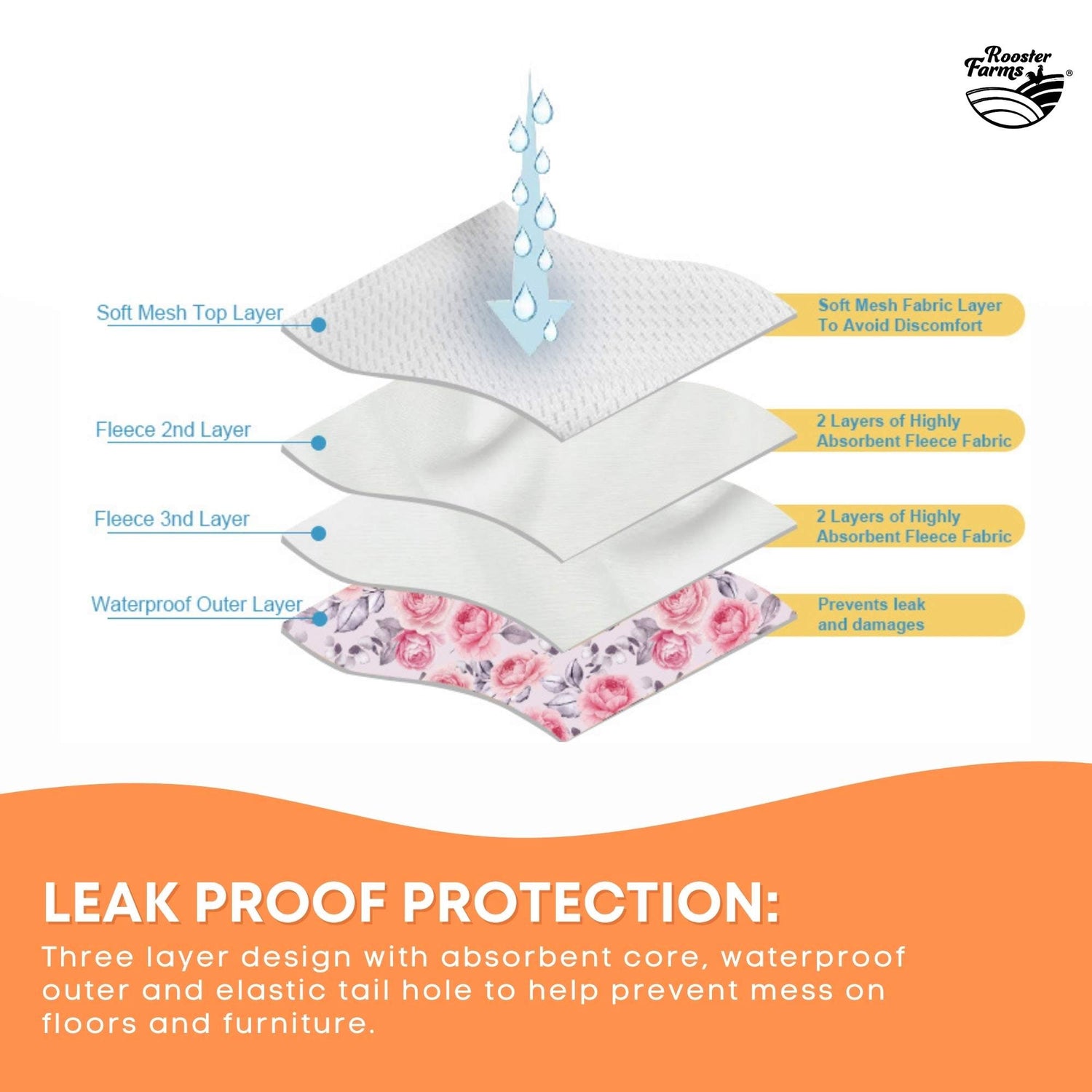 - Leak Proof Protection: Three layer design with absorbent core, waterproof outer and elastic tail hole to help prevent mess on floors and furniture.