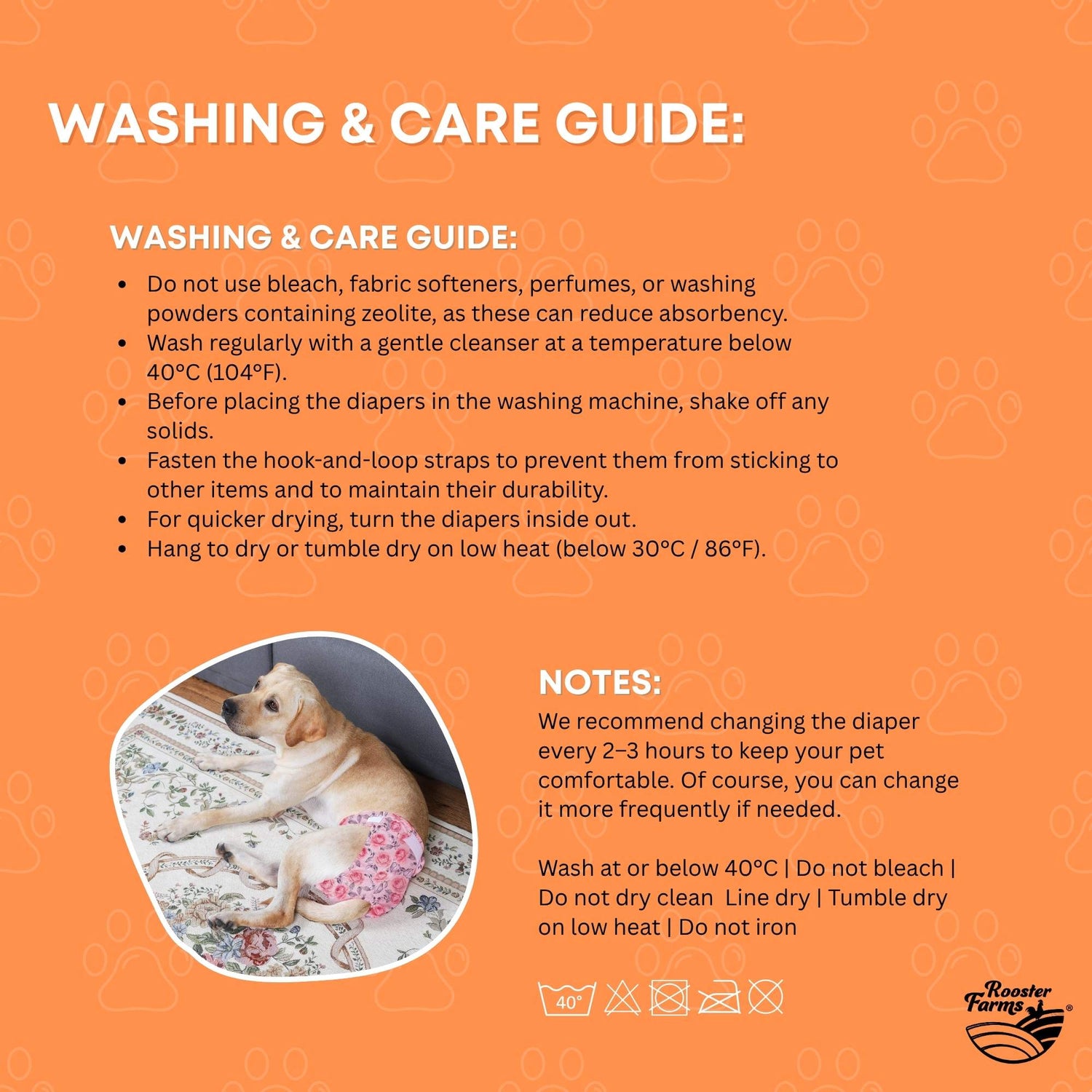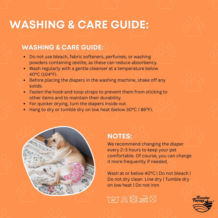 Rooster Farms X-Small Female Dog Diapers 3-Pk Washable Reusable Nappies Hook + Loop Fit will keep your pup comfortable and your home clean! Soft, secure, and eco-friendly, these reusable nappies are perfect for heat, periods, incontinence, or puppy training.