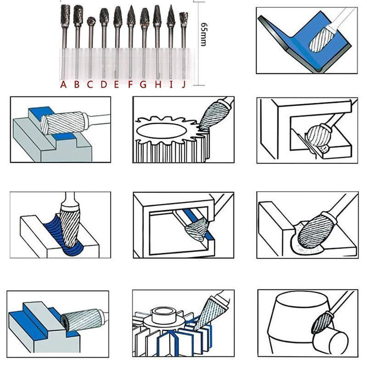 Whether you're working on mould finishing, weld seam smoothing, or fine detailing in sculpture or mechanical components, this burr set ensures clean results and operational efficiency.