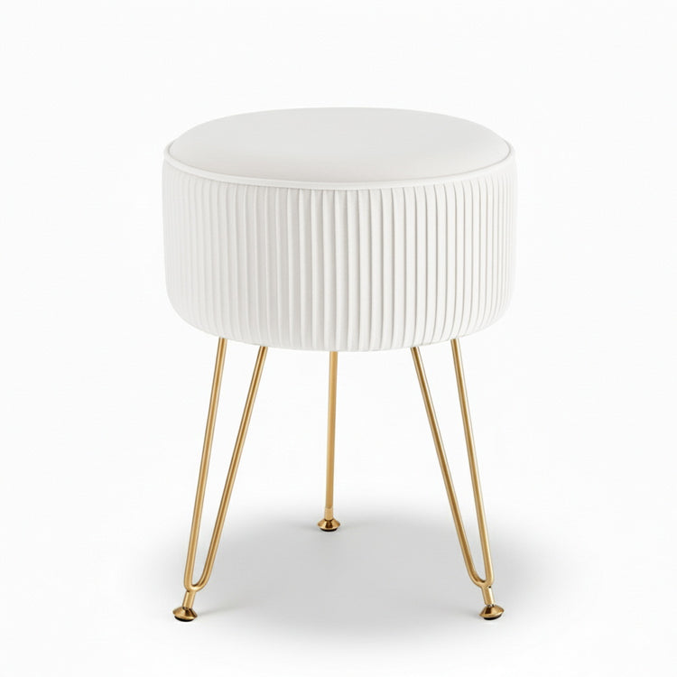 Round velvet Artiss footstool with vertical stripe design, durable MDF frame, and high-resilience foam padding. Features protective metal legs and simple assembly.