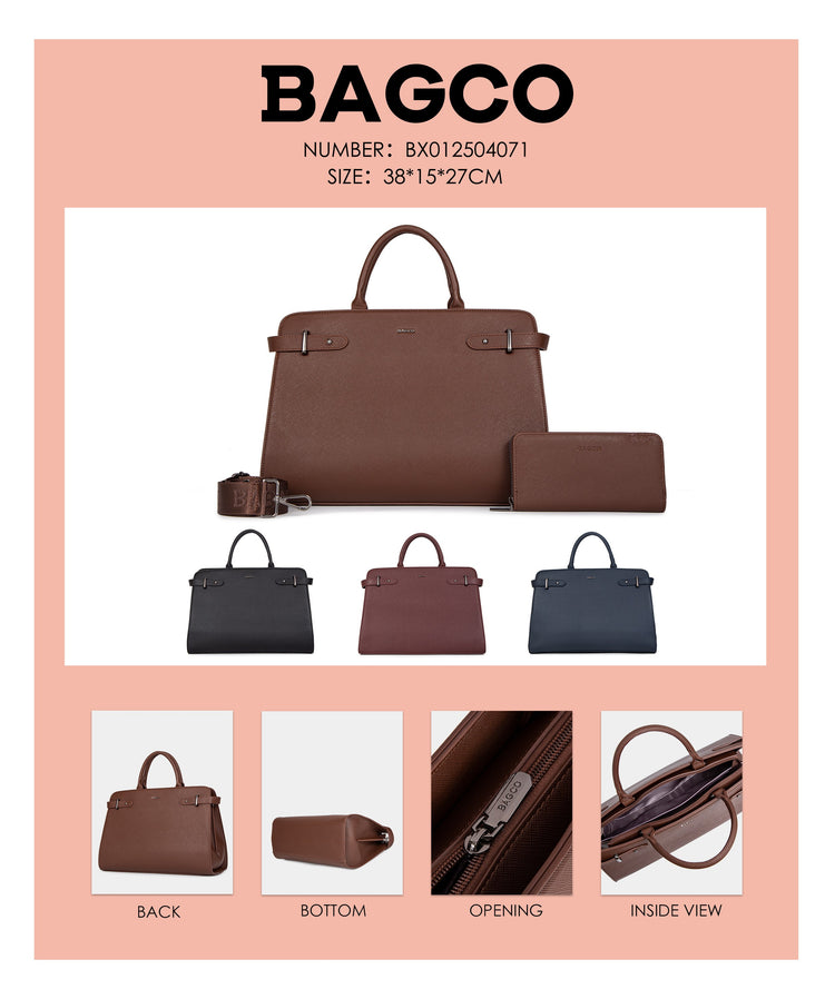<div class="product-copy"> <p>The <strong>Bagco Bravura Leather Tote Set</strong> blends timeless sophistication with modern versatility. Designed for both business and leisure, this structured tote features clean architectural lines, a refined matte finish, and matching accessories for a complete, polished look.</p> <ul> <li>Material: Premium <strong>Leather</strong> (PU Leather)</li> <li>Dimensions: 60 × 39 × 60 cm</li> <li>Weight: 1.33 kg</li> <li>Carry: Dual top handles with a detachable/adjustable shoulder strap</li> <li>Organization: Spacious interior with secure zipper compartments and slip pockets</li> <li>Security: Durable metal zipper with signature <strong>BAGCO</strong> puller</li> <li>Details: Smooth matte texture, reinforced edges, fine stitching, and tone-on-tone hardware</li> <li>Includes: Coordinated matching wallet and branded shoulder strap</li> </ul> <p><em>Elegant, practical, and built to carry your world — from boardroom to weekend escape.</em></p> </div>