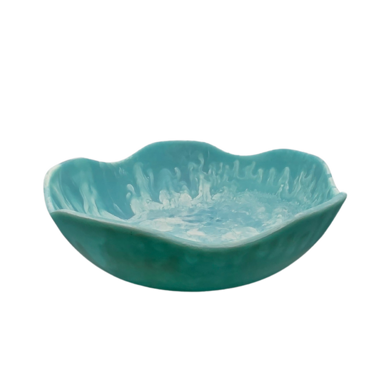 Bring a touch of coastal charm to your home with this handmade resin bowl, featuring soft wavy edges and an ocean-inspired swirl design. Crafted by hand in India, each piece is uniquely poured, offering a one-of-a-kind addition to your serveware or decor collection.