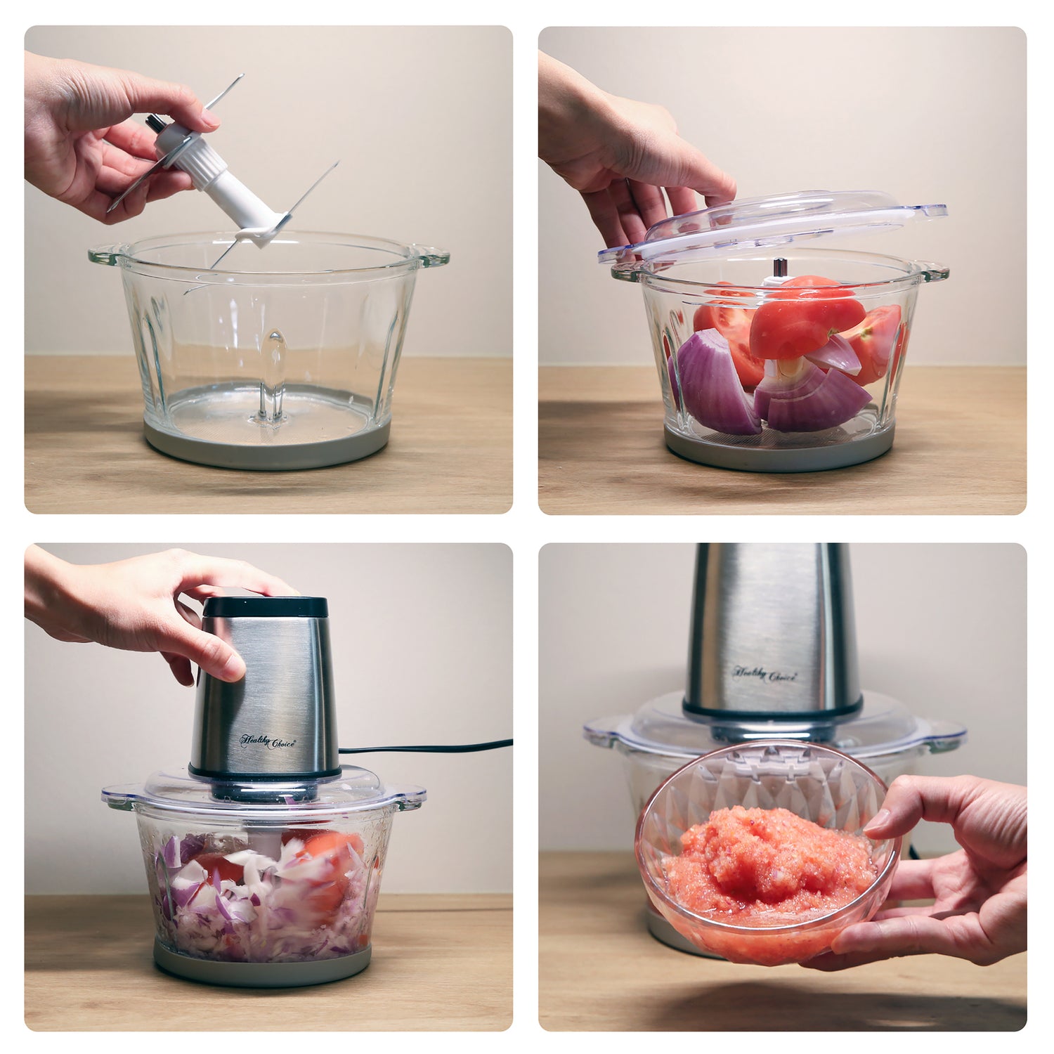 - Large Powerful Food Chopper, two speed settings, stainless-steel power motor, large two litre glass bowl, powerful to crush ice, two detachable stainless-steel blades to use single or double, non-slip silicone ring base, easy to use push buttons, easy to assemble, easy to clean, dishwasher safe parts