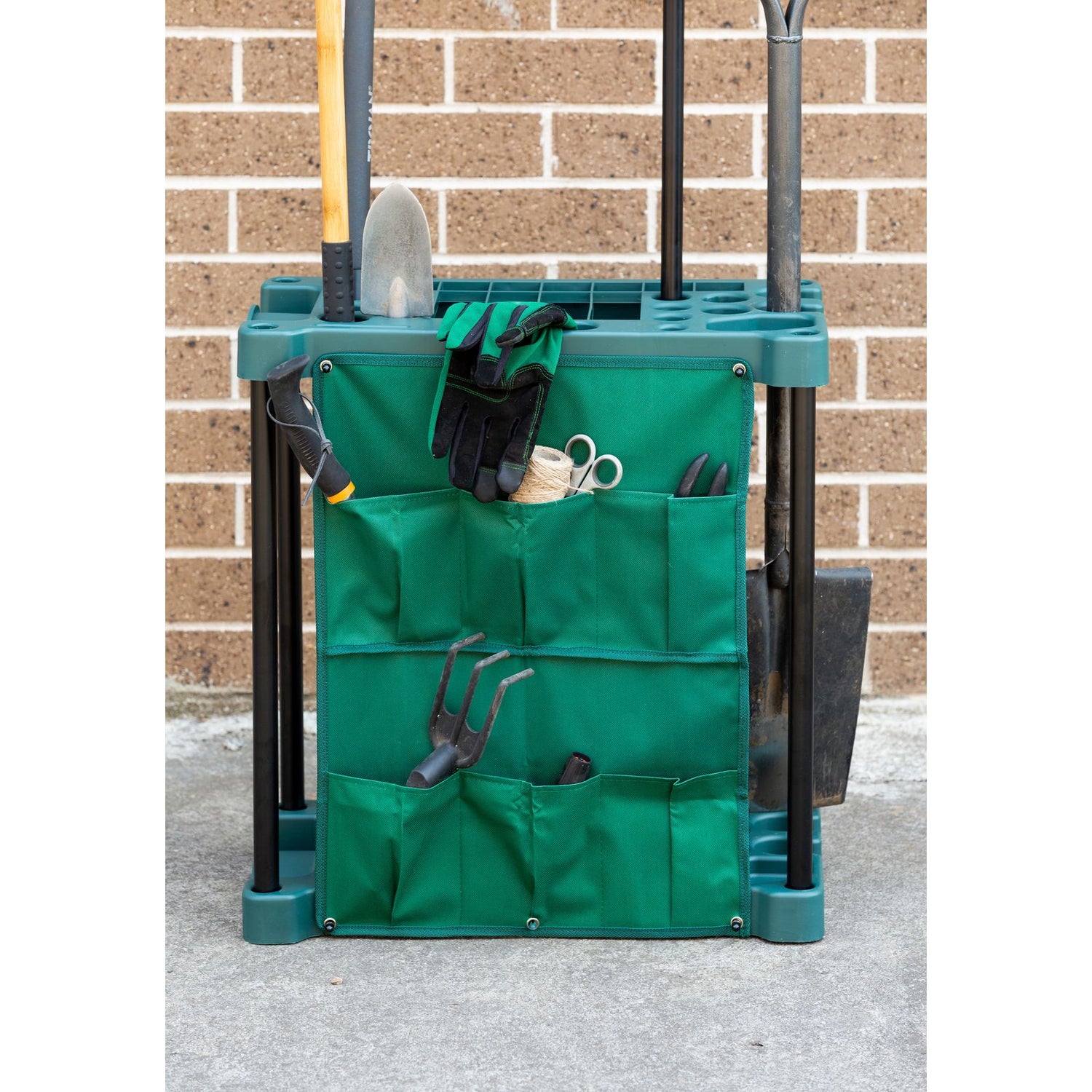 - Garden Tools Storage Rack, holds long and short-handled tools as well as small accessories compartment, attachable additional compartment pouch included, 40 tool slots, durable plastic construction to help resist against rusting, rotting, chipping and peeling, sturdy iron pipes, top-loading tool slots, bottom grooves keep tools stored in place, minimal assembly without any assembly tools required, suitable for indoor and outdoor use