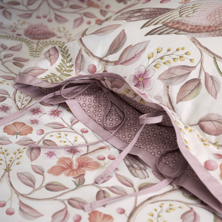 The Garden of Dove Off White Cotton Quilt Cover Set from Pip Studio is richly decorated with roses, tulips, turtledoves, and sparrows in soft pastel colours of black, blush, brown, red, burgundy, and purple. The reverse side surprises with a playful star print. Luxuriously finished with a flat piping, quilted edge, and padded buttons for double-sided use of both duvet cover and pillows.