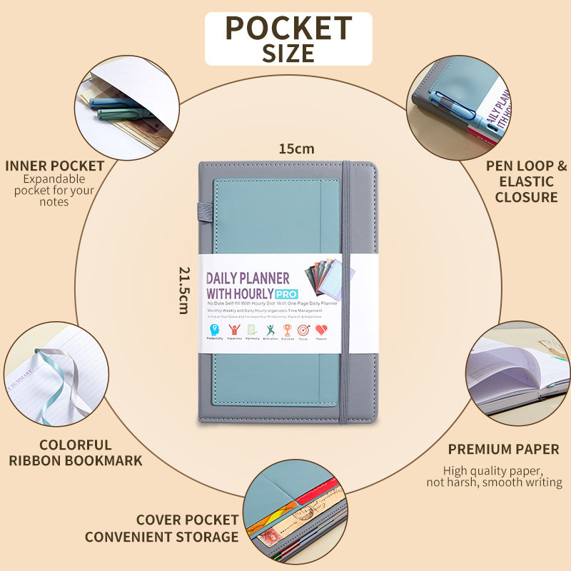 • Premium & Practical Design: The planner features a durable and stylish two-tone PU leather cover with a convenient front pocket for cards or notes. An elastic closure band, a pen loop, dual ribbon bookmarks, and an expandable back pocket add layers of practical functionality.