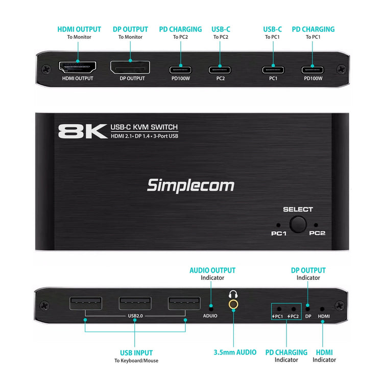 Simplecom KM470 2-Port USB-C KVM Switch 8K Docking Station