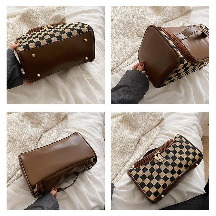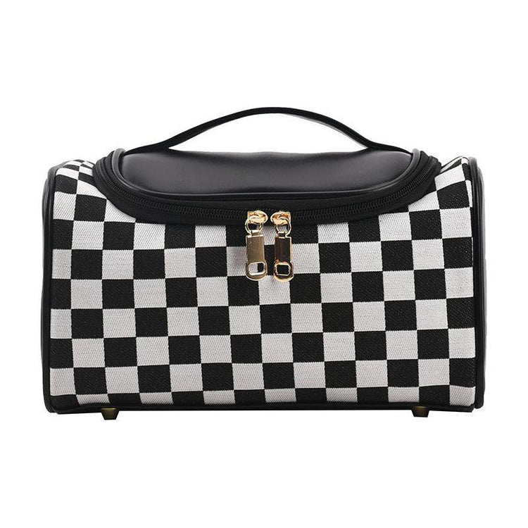 This chic checkered cosmetic bag is the perfect accessory for organizing your beauty essentials while on the go. With a sleek zipper closure and a convenient handle, it allows easy access to your items while keeping them secure. The spacious interior is ideal for holding makeup, toiletries, and other small items, making it the perfect travel companion. Its stylish design adds a fashionable touch to your everyday essentials.