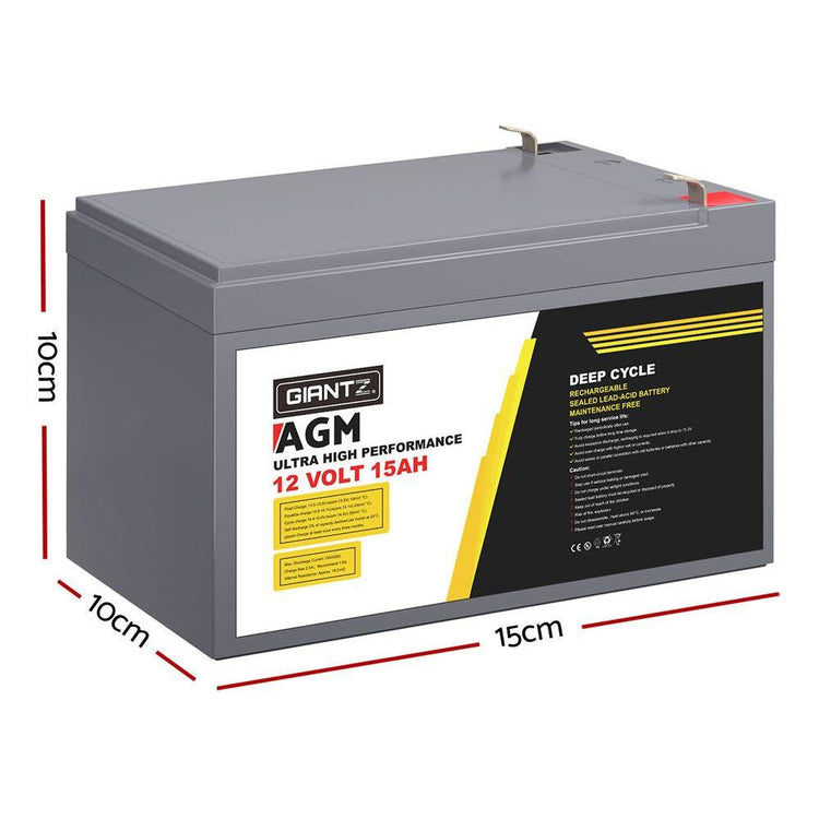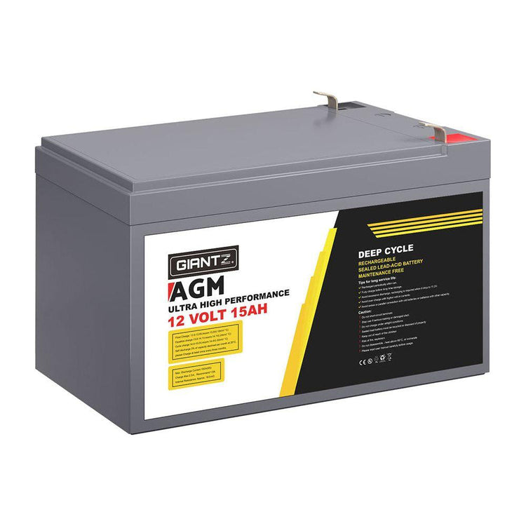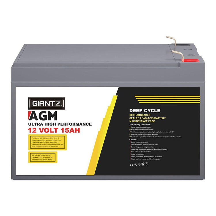 Need portable power? Our Giantz Deep Cycle Battery provides off-the-grid power supply for 4WD vehicles, caravans, campers, trailers, motorhomes, saltwater/marine applications, and all 12V appliances including portable fridges and washers. With better low-temperature performance, the battery will perform perfectly in various environments. The battery features an industry-leading build life of up to 1400 cycles, making it one of the most enduring in its class. What you get is a longer, consistent and more drawn-out charge all the time. With its advanced AGM technology, the battery enables better electrolyte absorption, cyclic stability and frequent charging without affecting performance. The bolt-down terminals also allow for a more reliable experience, and the high oxygen-recombination efficiency results in superior deep discharge recovery. The maintenance-free deep cycle battery is completely sealed, spill-resistant and does not leak gas for added safety and durable use. With a convenient carry handle, portability is ensured. When you need power on the road, you need a Giantz Deep Cycle Battery.