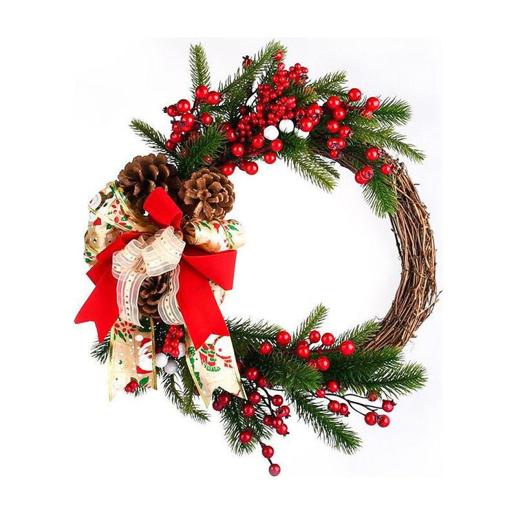 • 22-inch wreath with pine cones, red berries, and ribbon bow.