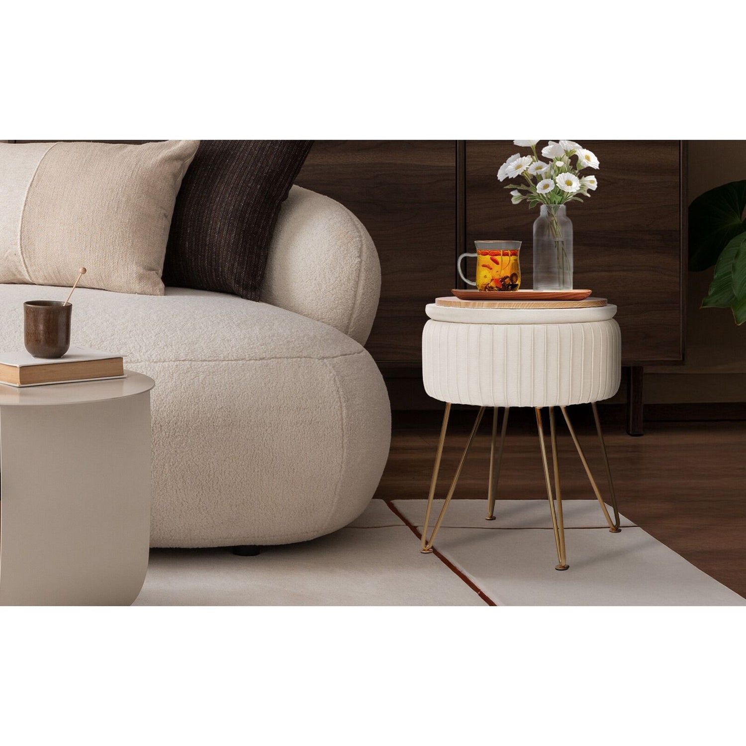 Side Table Storage Ottoman - Velvet Padded Stool Vanity Footstool REMY CREAM BEIGE