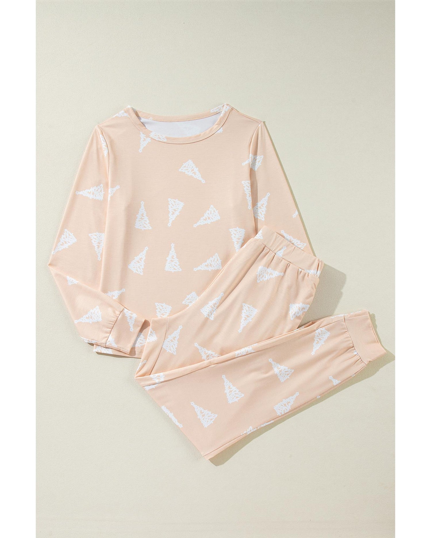 Apricot Christmas Tree Print Loose Fit Two Piece Pajama Set - S