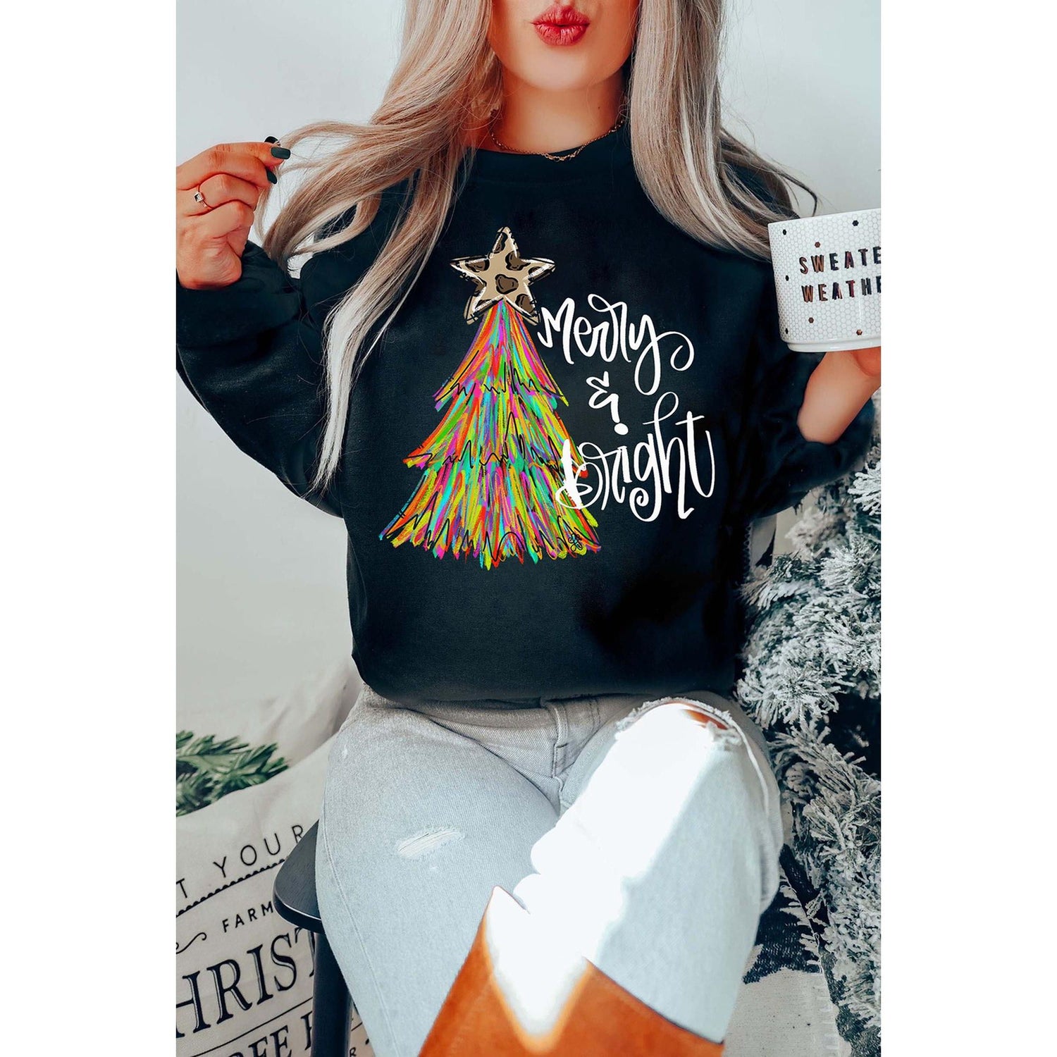Black Merry & Bright Christmas Tree Graphic Sweatshirt - XL