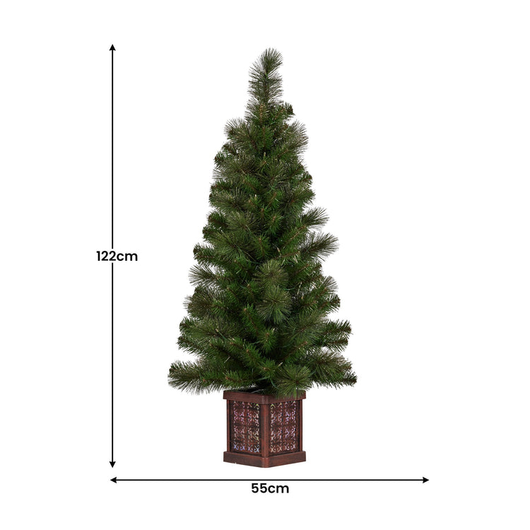 Bring festive sparkle to any corner with the 4ft Glittery Gold Pine Christmas tree. Its shimmering gold glitter foliage is paired with a patterned base pot for a sophisticated style. Built-in multi-functional LED lights offer ten settings, from warm white, vibrant colours and pastels, all controlled by a handy foot pedal. Perfect for entrances, tables or small spaces, it’s a dazzling Christmas addition.