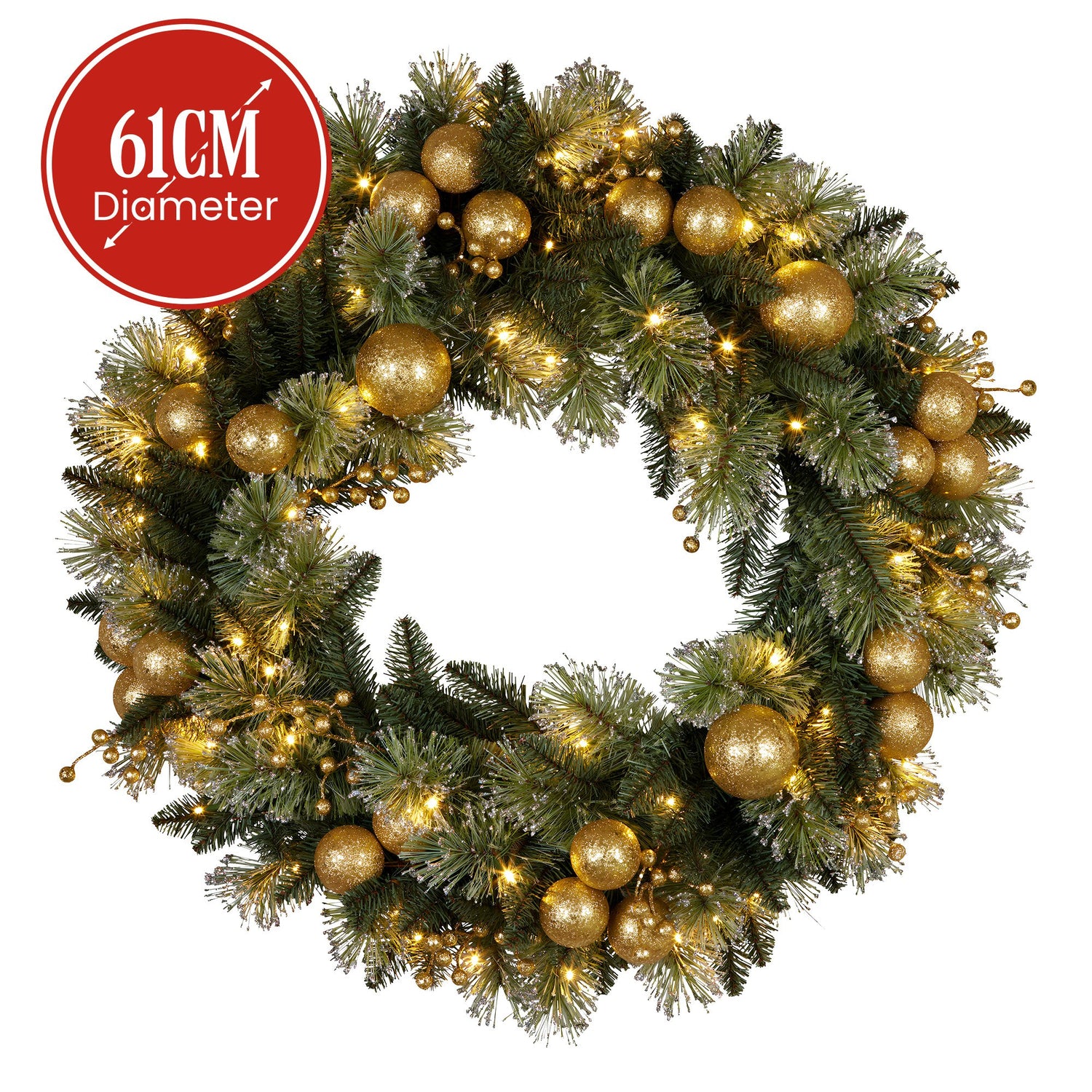 No time for trimming? No problem. This 61cm wreath comes ready to hang with glitter tipped foliage, classic gold baubles and berries for effortless festive flair. Its wrapped with 50 warm white LEDs and includes a 6-hour timer for worry-free lighting. A holiday must for doors, walls or mantels.
