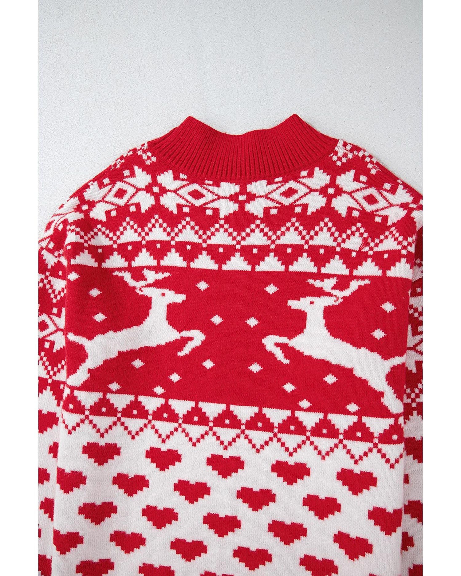 • Fiery Red Merry Christmas Reindeer Heart Pattern High Neck Sweater