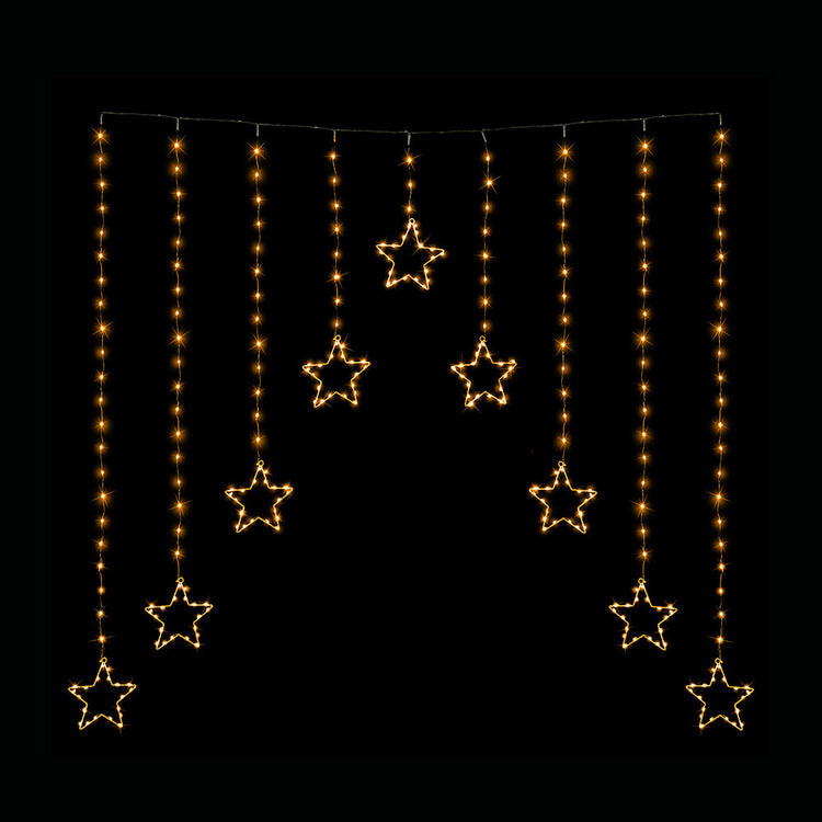Embrace the celestial allure of our LED Gold Wire Star Curtain and let its radiant glow illuminate your festivities with elegance and enchantment. Witness the magic unfold as the delicate Gold Stars cast their warm and inviting glow, creating cherished memories that will last long after the Holiday Season.
