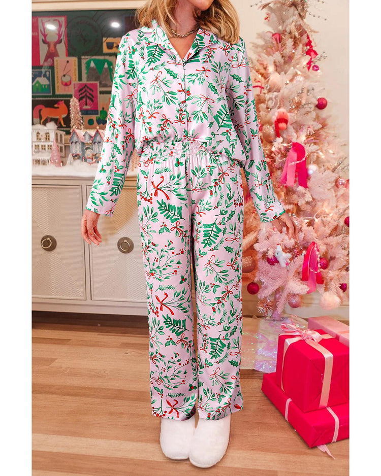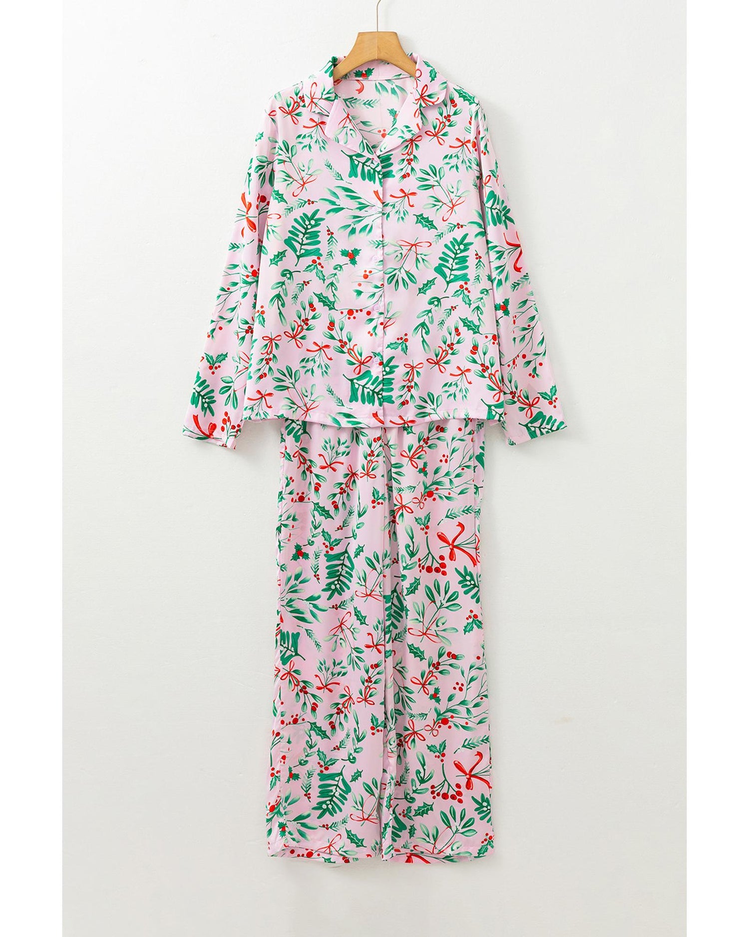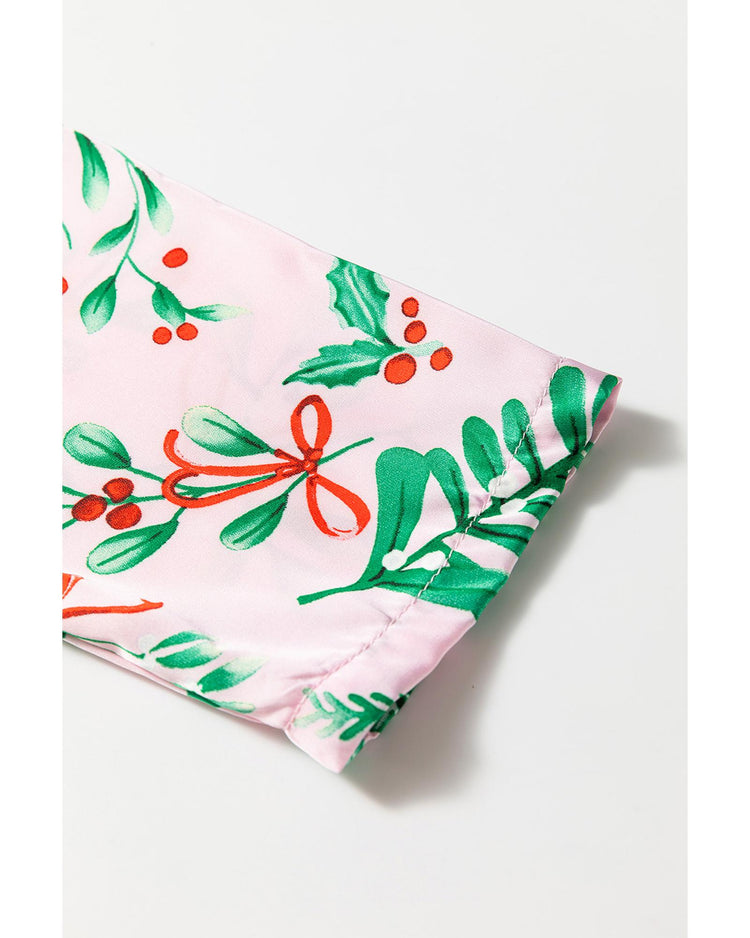 Pink Christmas Berries Plant Print Satin Long Sleeve Pajama Set - S