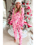 Pink Christmas Tree Print V Neck Buttoned Pullover and Drawstring Pants Lounge Set - L