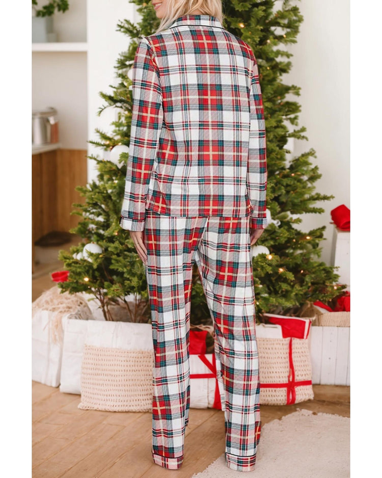 Red Christmas Plaid Print Two Piece Long Sleeve Pajamas Set - S