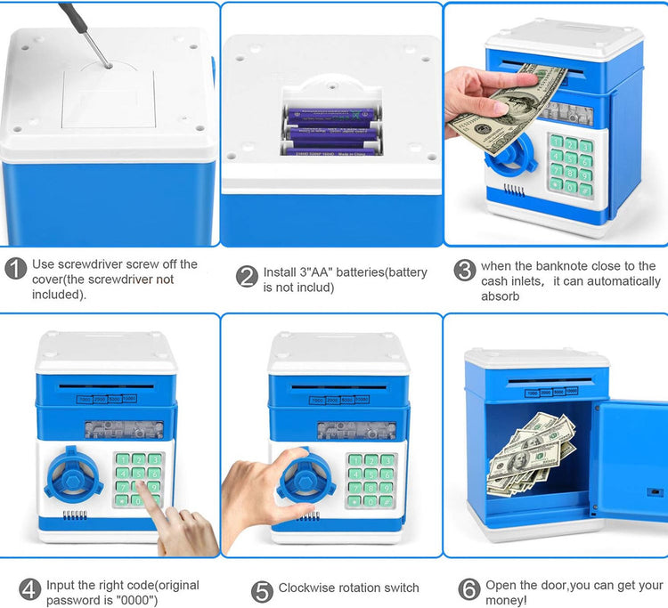 • Password Safe Money Box:Enter the 4 original password(default: 0000, Changable passwords as you like), the green light will be on, the ATM can be opened. If you enter the wrong password, the red light will turn on and the sound of "PLEASE TRY AGAIN" will prompt you (you can't open it,if the password it's wrong)