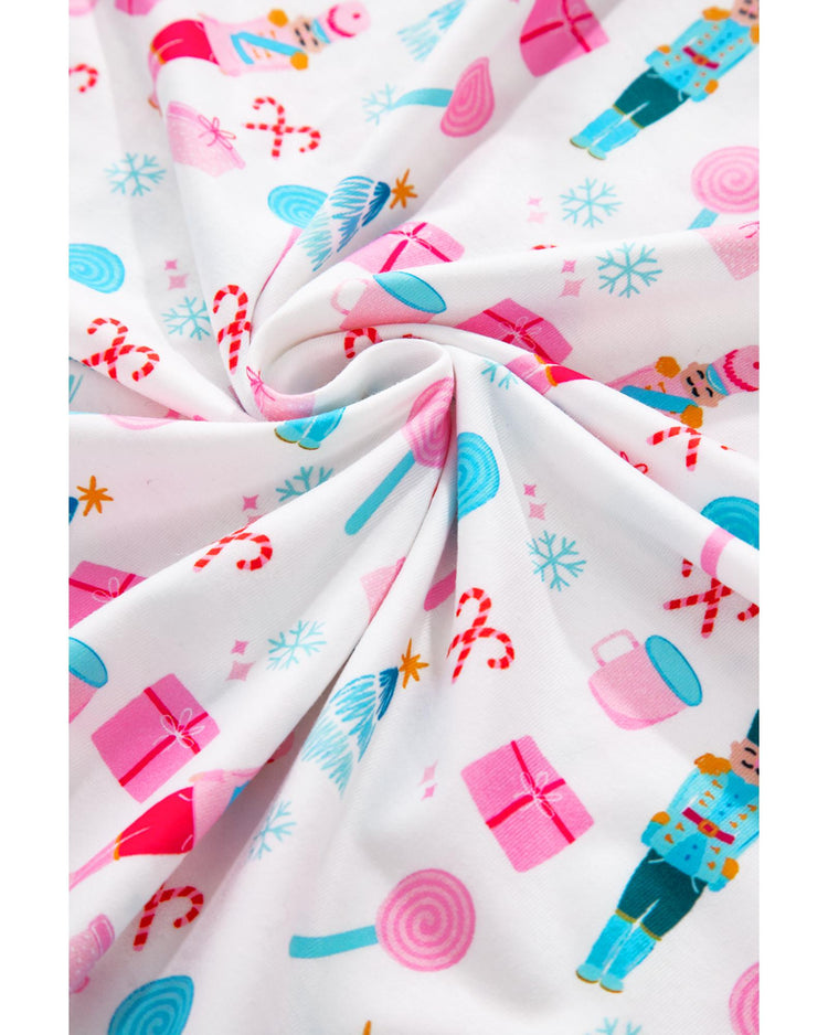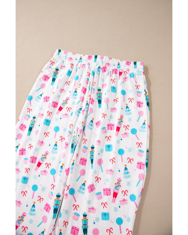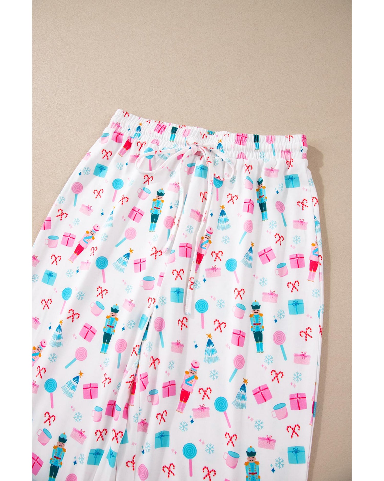 White Christmas Pattern Long Sleeve Top and Wide Leg Pants Set - L
