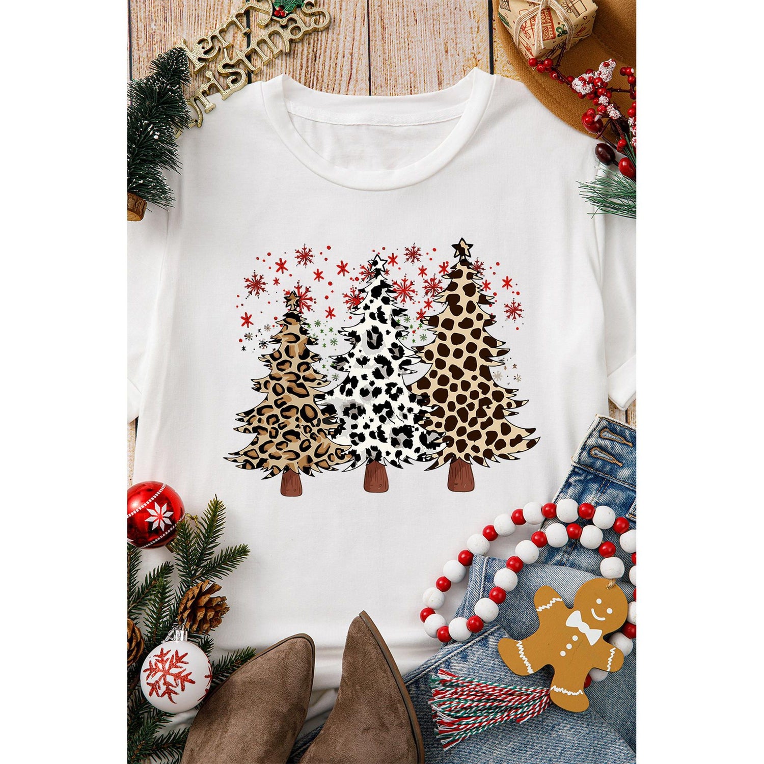 - White Leopard Christmas Tree Graphic Crewneck Tee