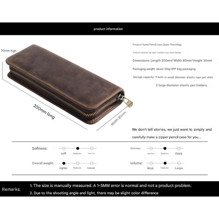 Keep your pencils, pens, and art supplies organized in this beautifully crafted genuine leather pencil case. The vintage-inspired design and durable construction make this pen holder a stylish and practical accessory for artists, students, and anyone who appreciates quality craftsmanship. The zippered closure and interior elastic loops provide secure storage for your writing instruments.