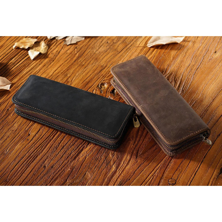 Genuine Leather Pencil Case - Vintage Style Zip-Up Pen Holder
