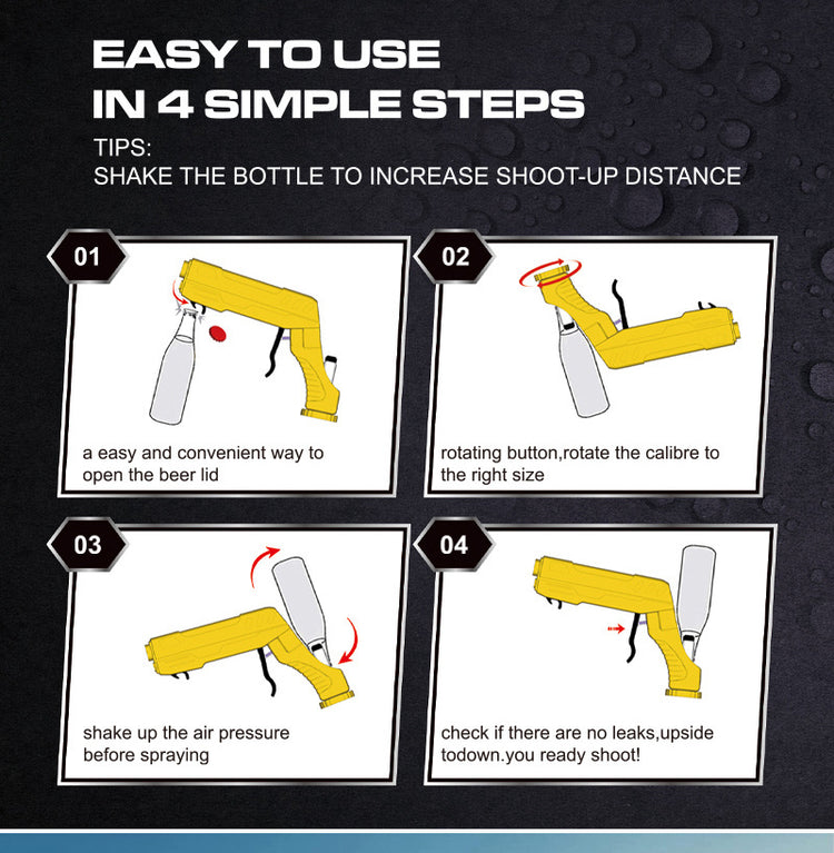 • Ultimate Party Accessory: Load your favorite champagne, beer, or even soda (recommended for 330ml glass bottles for best effect) and get ready to spray! It creates a thrilling stream, perfect for celebratory moments.