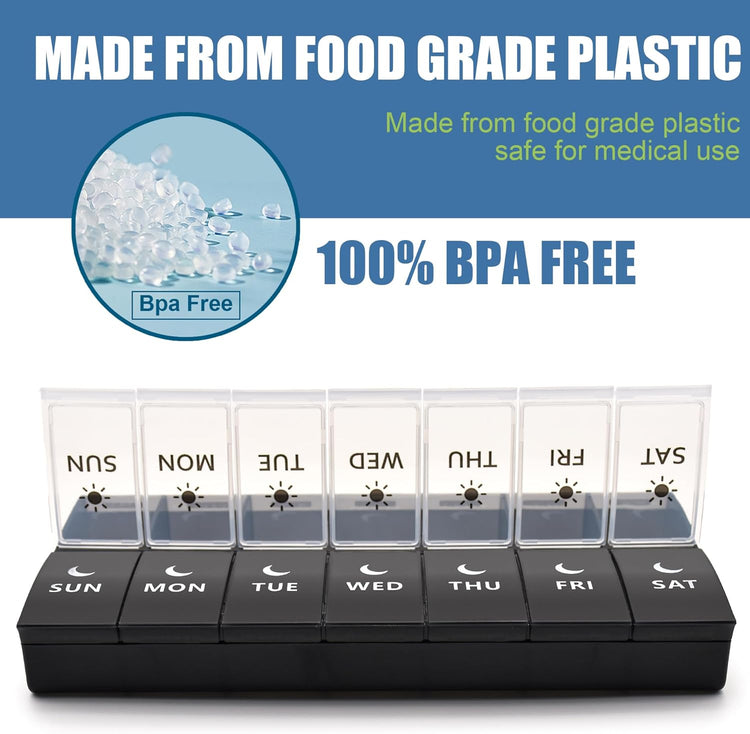 【Safe and Healthy】The daily Pill sorter is made of food grade BPA-Free materials, which is non-toxic and non-harmful, Sturdy and durable.