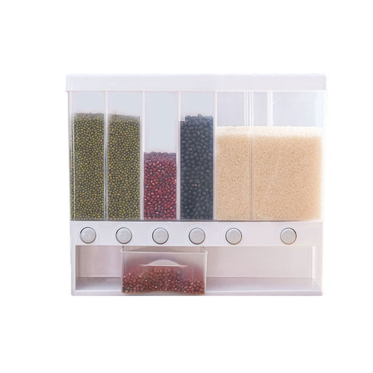 This wall-mounted automatic rice dispenser offers an efficient and organised way to store and dispense grains, rice, and cereals while saving valuable kitchen space. Crafted from high-quality plastic, the storage tank features a sealed design that keeps your grains fresh by preventing moisture and pests from entering. With adjustable partitions, you can easily sort and store different grains, making it convenient to access and manage your kitchen essentials. The push-button dispensing mechanism allows for precise portions, helping you to manage servings efficiently. Its sleek and compact design ensures a clutter-free kitchen, and installation is hassle-free with a strong adhesive kit included.