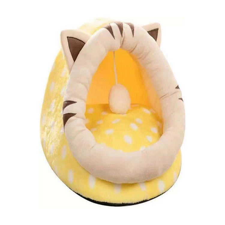 Yellow Half-Enclosed Cat Bed - Soft Short Velvet Fabric with Sponge + PP Cotton Filling, S Size (28x28x30 cm)