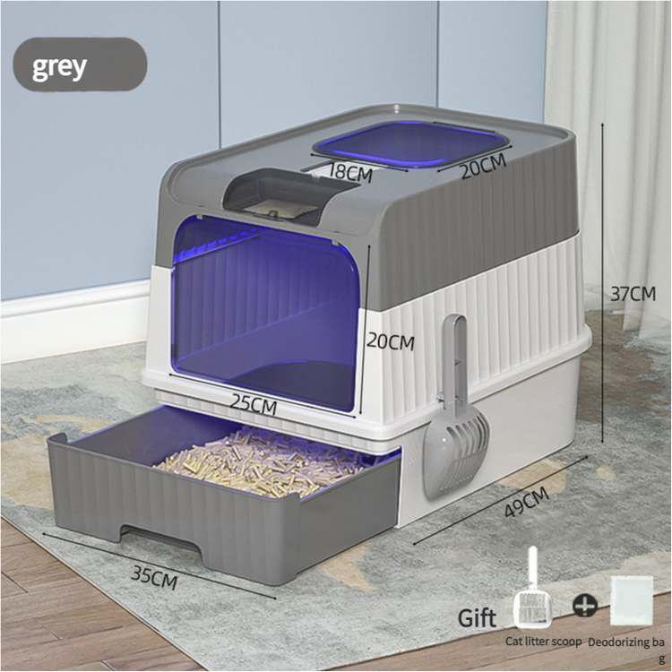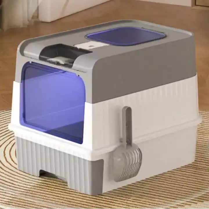 Automatic UV Sterilizing Cat Litter Box – This advanced cat litter box features a fully enclosed design to prevent odor leakage, while the UV germicidal technology ensures a clean and hygienic environment for your pet. The built-in UV light automatically sterilizes the interior, killing bacteria and reducing odors. This modern litter box is perfect for maintaining a fresh-smelling home, offering your cat a private, clean space. The easy-to-clean design and integrated scooper make maintenance effortless.