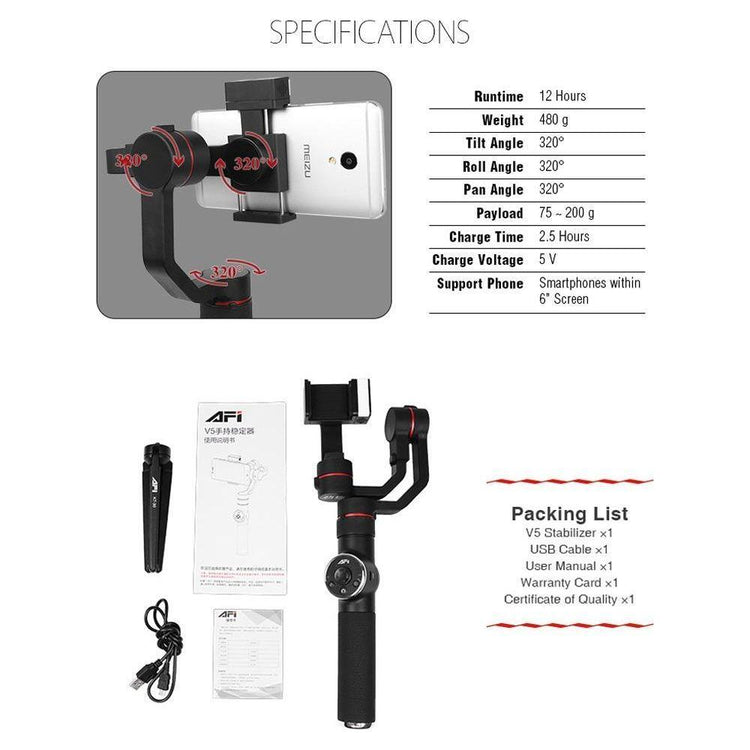 • 320-degree angle of pitch, roll, and panning for steady and smooth filming