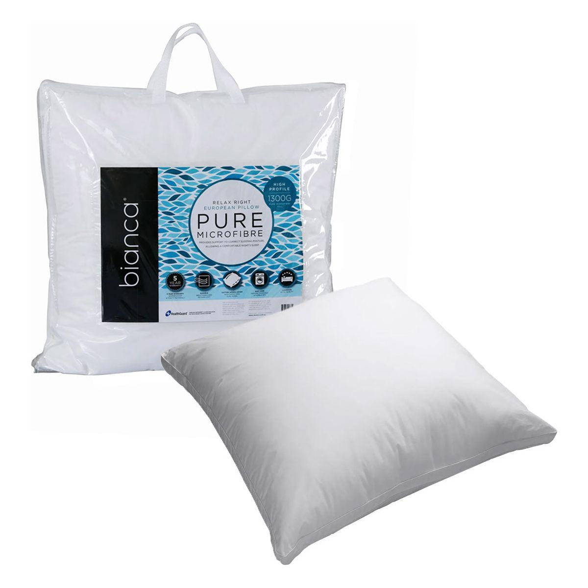 This 1300g Relax Right Pure Microfiber European Pillow 65 x 65cm by Bianca is a luxurious hotel quality pillow made using a fine cotton japara cover, gusseted and dual piping. A durable pillow that retains loft, can be machine washed and tumble dried. Treated with Health Guard, an Anti-microbial process that reduces allergenic reactions to dust mites. 5 year warranty against workmanship and faulty materials.