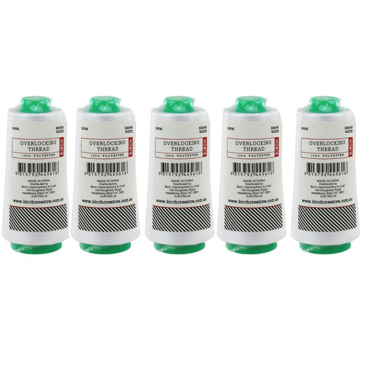 5 Pack White Overlocking Thread 2000m Polyester Birch Overlocker Cone Spool Sewing
