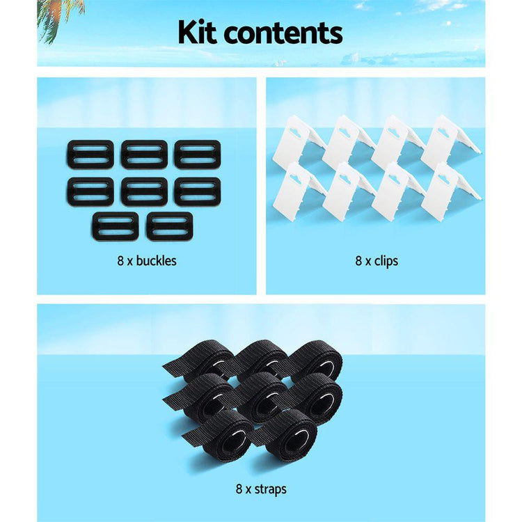 If you have a pool at home, then a pool cover is essential as it keeps the water warm, prevents leaves and debris from dirtying the pool and reduces evaporation. A cover roller then helps you easily cover and uncover the pool as you need. But you also need to be able to attach the two securely together for them to work properly as they should. Perhaps you never had the attachment kit in the first place, or you just need a replacement. Whatever your situation, our AquaBuddy Pool Roller Strap Kit will keep you well-covered. The kit includes eight each of nylon straps, buckles and clips to secure your pool cover to the roller. The kit is easy to install – you stick the straps onto the roller, use buckles to secure clips on the straps, then simply clip-on the clips to the pool cover. The parts are crafted from durable nylon, PP and PE material that is both wear-resistant and UV-resistant to ensure longlasting use.