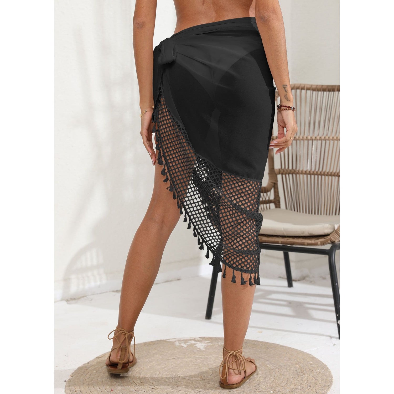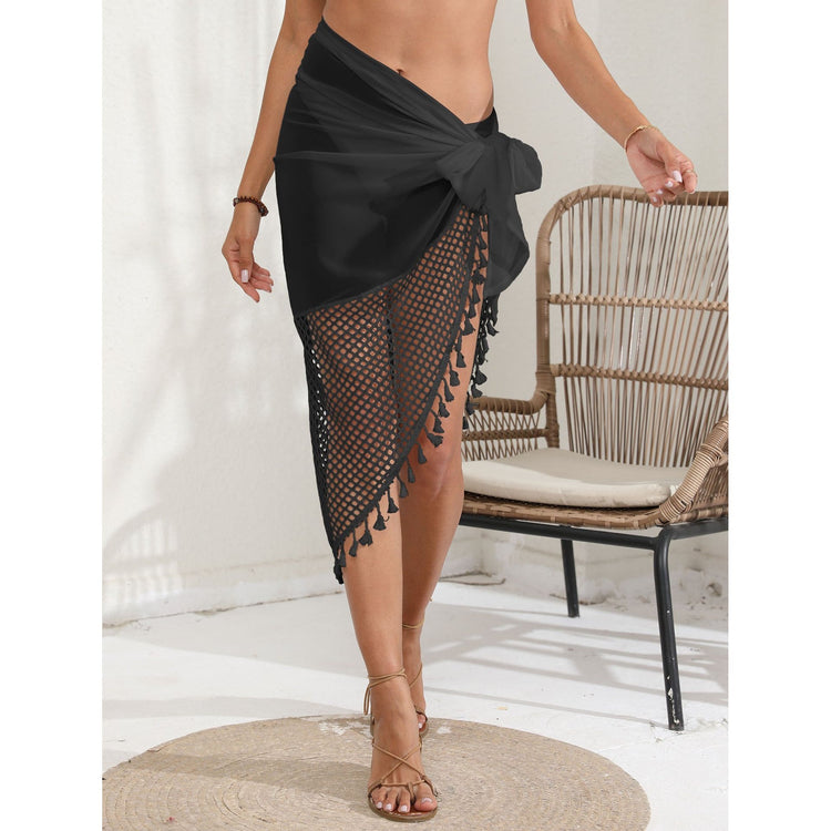 Black Women's Mesh Detail Beach Wrap - Tassel Trim Swim Cover-Up 95x195cm