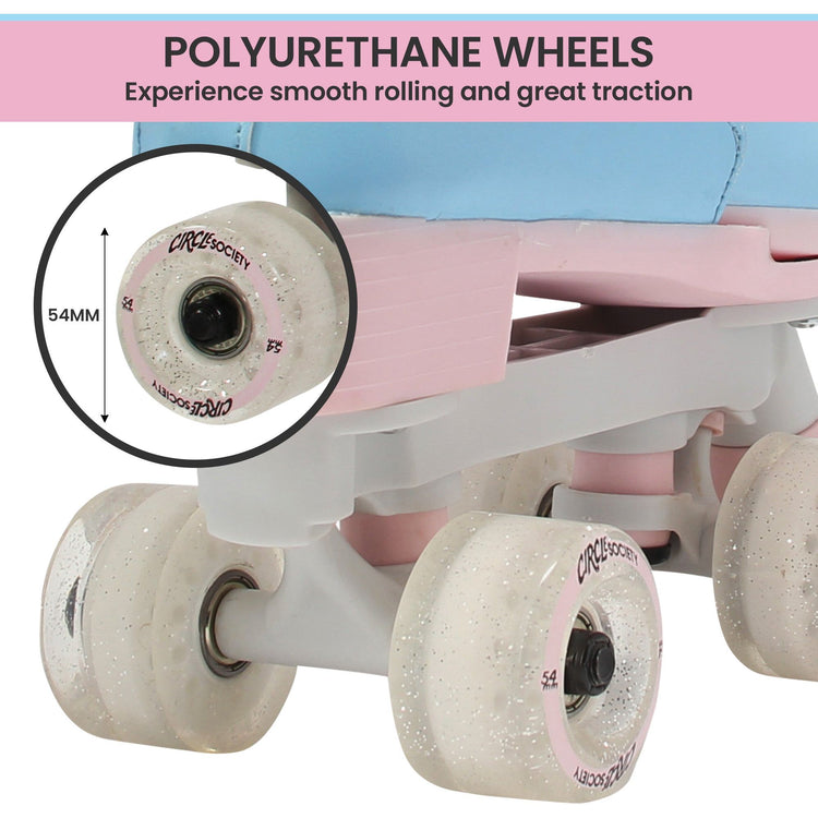 Skate through the streets with great flair sporting Circle Societys Adjustable Roller Skates! Featuring a vibrant design and smooth-rolling polyurethane wheels, these skates are perfect for indoor and outdoor adventures. With an easy-push button for adjustable sizing (US sizes 3-7) and ABEC 7 sealed bearings, youll be grooving down the rink with a snug fit and reliable performance. Plus, dual front brakes ensure safety and control during every ride. So whatre you waiting for? Strap on and let the good times roll!