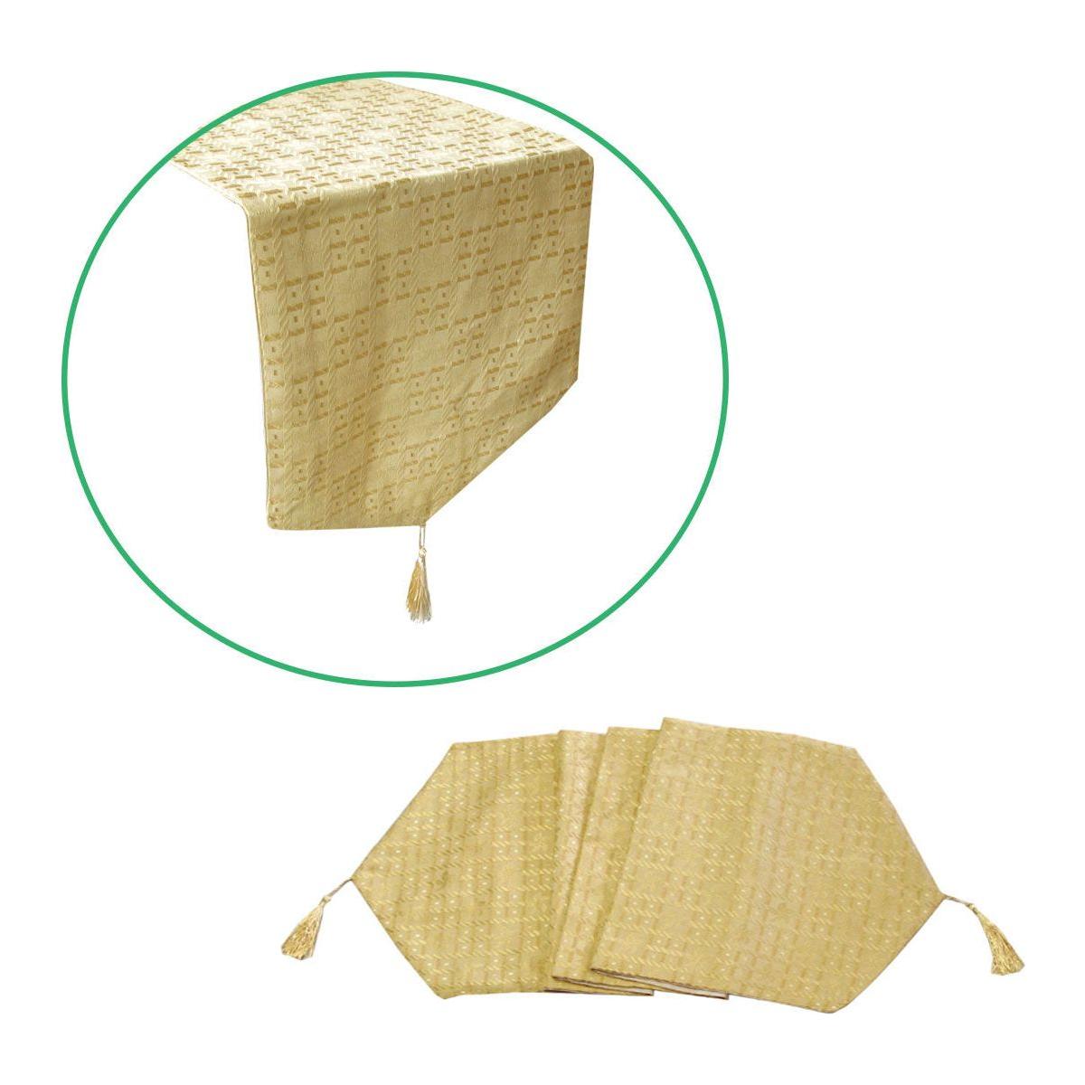 Keep you dining table looking stylish and fashionable with this Faux Silk Jacquard Table Runner Gold. Table runners are important accessory to accent your dining table instantly. This table runner features a stylish geometric jacquard pattern in striking colour tone that fits most table accessory. It is made from high quality and easy care Polyester fabric.