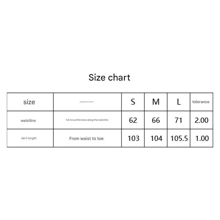 • Skirt Length: S 103cm, M 104cm, L 105.5cm (±1.0cm tolerance)